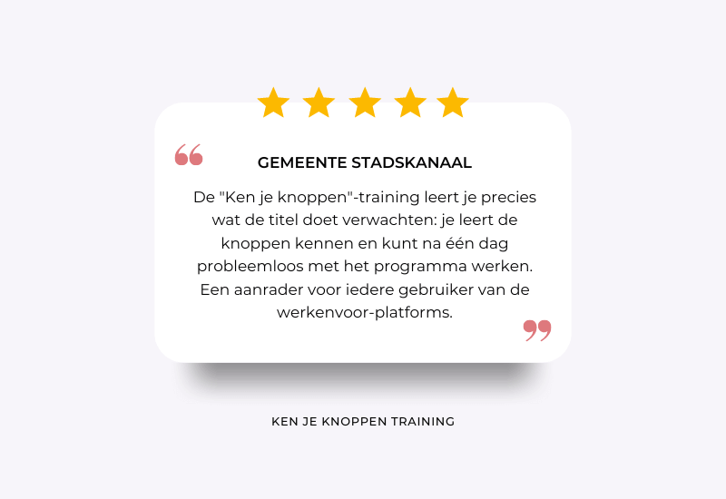 Tijdens de ‘ken je knoppen’ training nemen we gebruikers, die al bekend zijn met de basisfunctionaliteiten van de software, mee om hun kennis naar een gevorderd niveau te tillen. Hoe maak je optimaal gebruik van alle mogelijkheden van het systeem en hoe werk je zo efficiënt mogelijk?Dat ontdek je tijdens deze hands-on training over het TSF recruitmentsysteem.